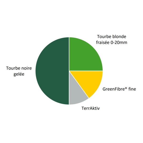Tourbe noire gelée de grande qualité, de tourbe blonde fraisée, de fibre de bois fine et de compost végétal biologiquement actif.