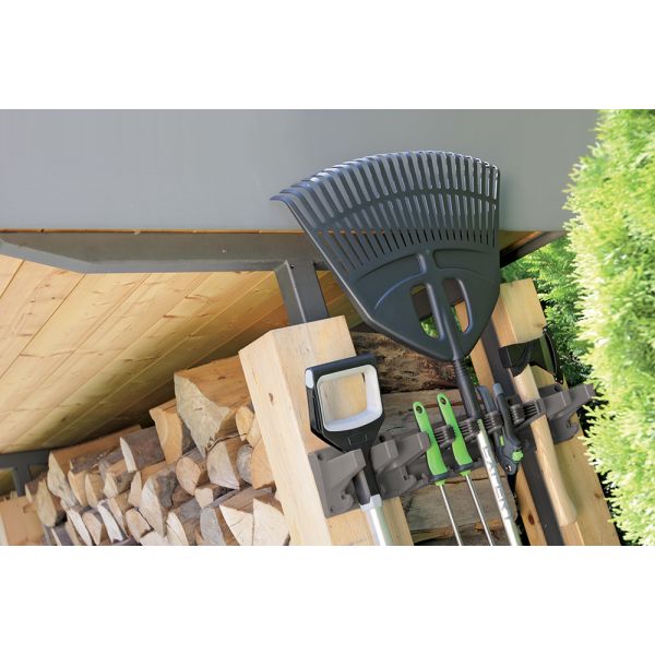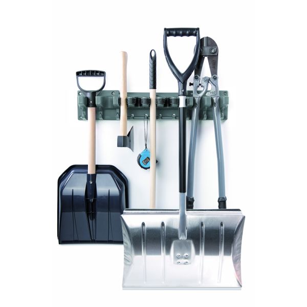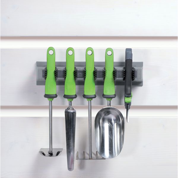 968818 : dispose de 5 emplacements prévues pour des manches de 2 à 3 cm. Dispose d'une bande de caoutchouc strié sur les 5 emplacements du milieu. Dispose de 4 emplacements supplémentaires, plus larges, pour des manches de 3 à 4 cm. Dispose de 8 troues (5.6mm de diamètre) pour la fixation. (Vis non fournies)