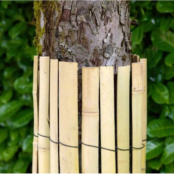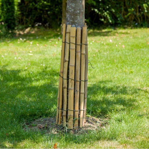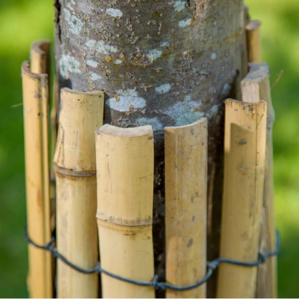 Cette protection en natte de bambou s'installe autour du tronc d'un jeune arbre ou d'une autre plante du jardin et du potager.